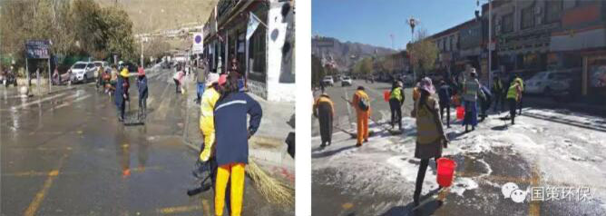 當天11:00~17:00,我公司出動大型灑水車2輛、人行道洗地車1輛、環(huán)衛(wèi)工人及管理人員共45人對扎寺廣場和珠峰西路(扎寺廣場至體育路路口)的路面進行沖洗,共計出動灑水車8車次,沖洗面積達20000平方米,耗資15000元。